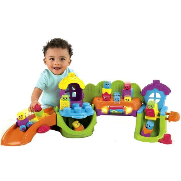 Замечательная развивающая игрушка для деток от 6 мес до 3 лет! Можно играть одному, а также вместе с друзьями, братиками и сестричками! Множество возможностей: соединять кубики и удивляться тому, что из этого получается! Когда малыш крутит валик, начинает играть музыка, светятся огоньки и человечки начинают по очереди выглядывать. Можно ставить фигурки (как пирамидку) одну на другую и все равно человечик, котрый сверху, будет под музыку подниматься и опускаться. Машинку-человечка можно катать с горочки, нажимая на рычаг. Справа есть другой рычаг. Нажимая на него, человечек падает вниз. Все это сопровождается интересными звуковыми эффектами.