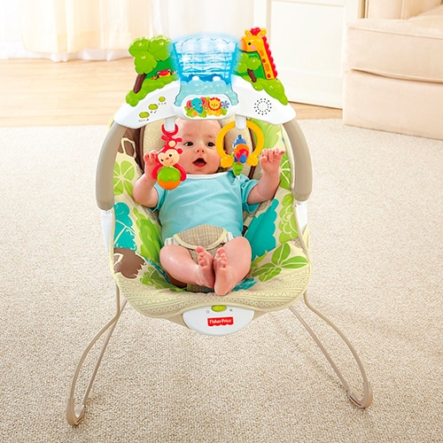 Шезлонг «Друзья из джунглей» прекрасно развлечет малыша звуками тропического леса, интерактивными игрушками, расположенными на съемной игровой дуге, а светящийся водопад непременно привлечет внимание Вашего малыша.