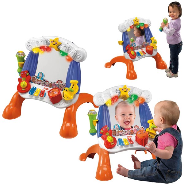 2. Создание своей мелодии: малыш может придумывать свои мелодии, нажимая на барабан, ксилофон, трубу или гитару и встряхивая микрофон. Игровой комплекс «Маленькое дарование – Сцена» от Fisher Price надолго увлечет Вашего малыша, унесет его в мира радости, веселья, музыки, песен и увлекательной игры!