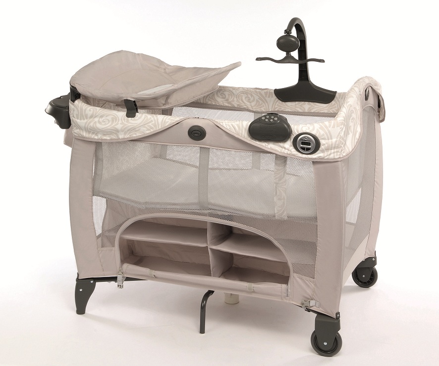 Манеж снабжен всем необходимым. Для малыша есть пеленальный столик, карусель с игрушками и электронный блок с функциями вибрации, музыки и подсветкой. Для удобства мамы манеж оснащен дополнительной полкой для памперсов и других детских принадлежностей. Кроме того, в комплект входят термометр и таймер.